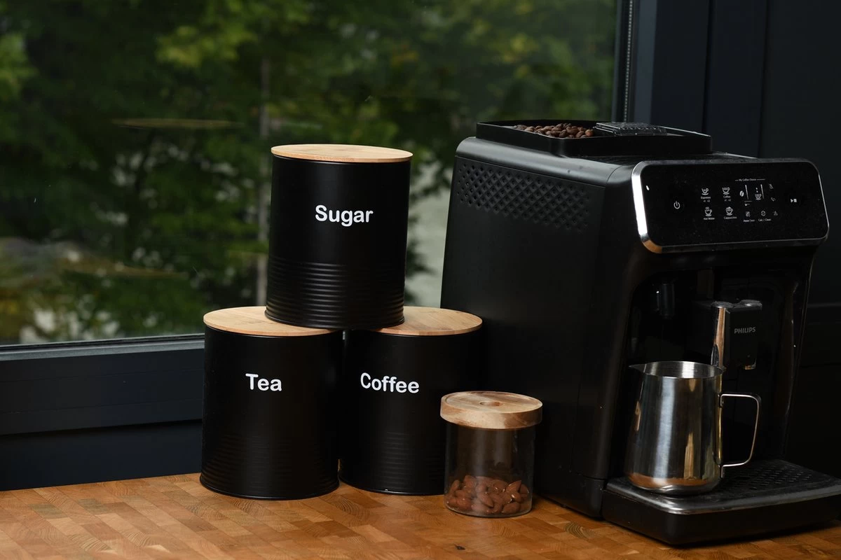 Bewaarblik – Voorraadpotten – Suikerpot – 3 stuks – Voorraadblik – Deksel Bamboe – Luchtdict Voorraadbussen Potten – Koffie Thee Suiker – Zwart
