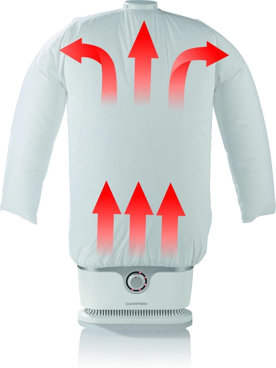 Plaats het gecentrifugeerde overhemd, blouse, T-shirt of trui over de opblaasvorm van de Cleanmaxx en met de bijgevoegde klemmen bevestigen. De timer op de gewenste duur zetten en de opblaasvorm blaast zich op en geeft tegelijkertijd warmte af aan het kledingstuk. Volledig automatisch!