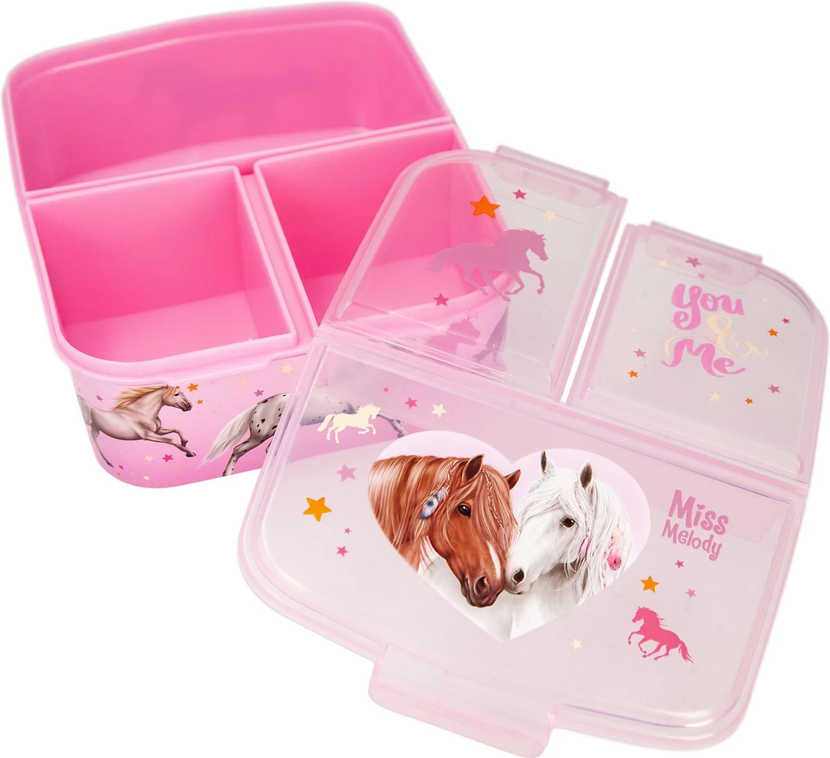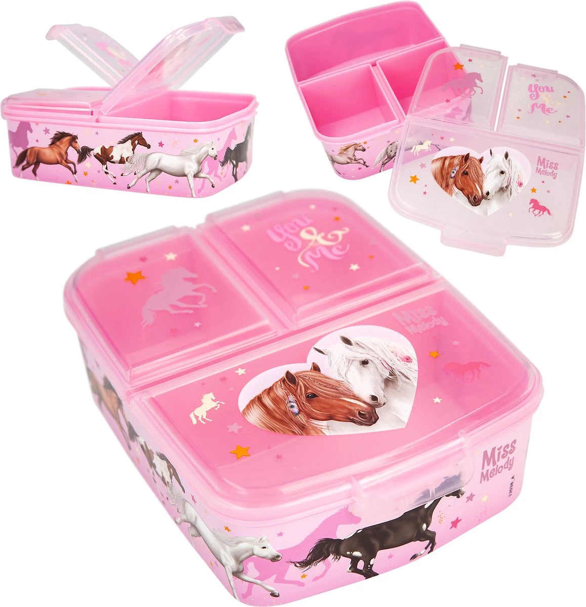 Voor ponytastische pauzes: de roze broodtrommel van Miss Melody met mooie paardenafbeelding heeft drie aparte vakken (1 groot, 2 klein) waarin je snacks en broodjes niet meer door de war raken. Met handige kliksluiting! Materiaal: kunststof PP, bevat geen bisphenol A (BPA) en geen weekmakers (ftalaten).