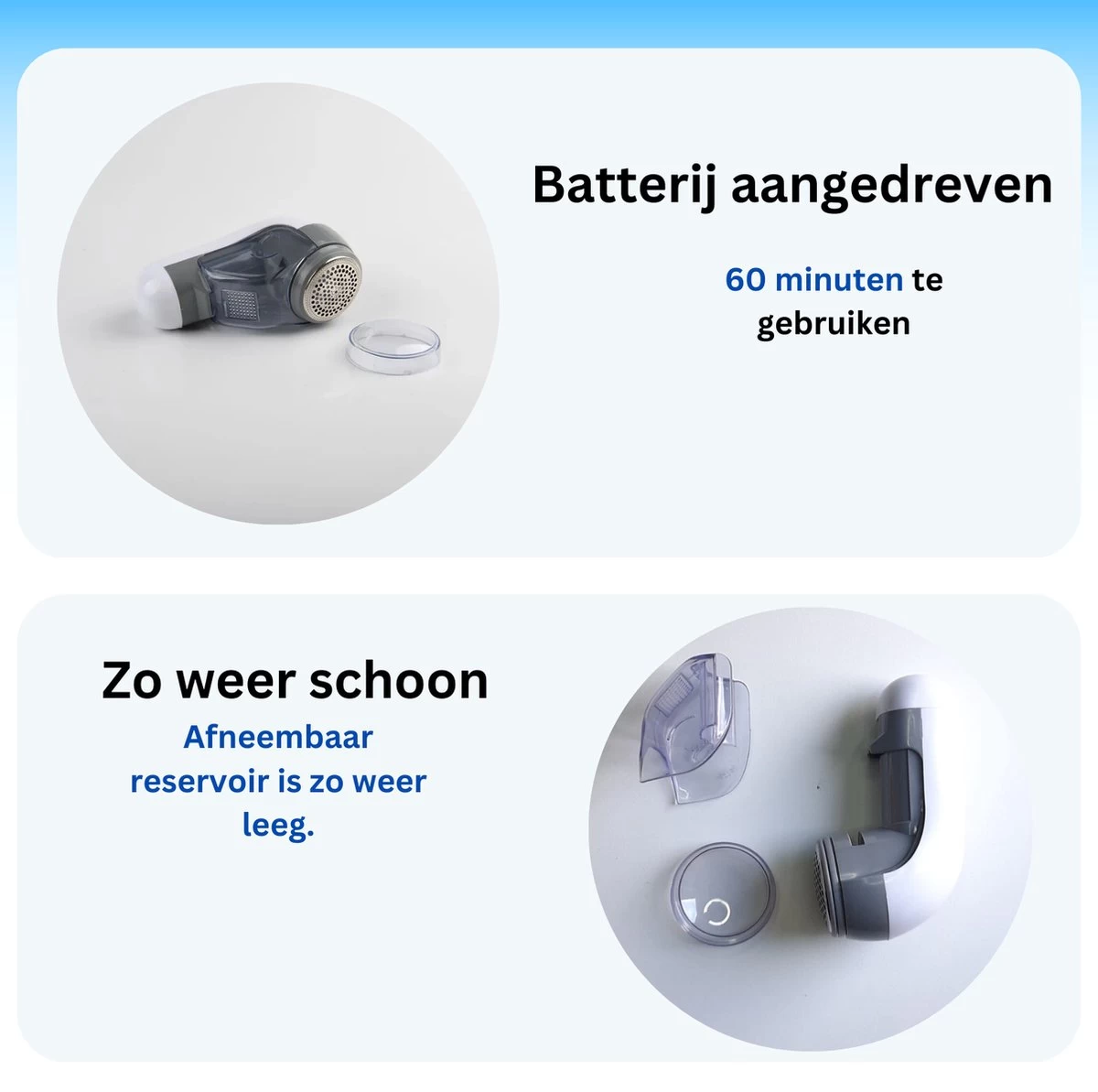 De Verkoopmarkt.nl pluizenverwijderaar maakt je favoriete kledingstukken of meubilair in enkele minuten weer zo goed als nieuw. Hij is met batterij wel tussen de 60 minuten non-stop te gebruiken. Van meubels tot dekbedden, door de 3 bladen die in de pluizenverwijderaar zitten is de ontpluizer overal voor in te zetten. Makkelijk schoon te maken met het borsteltje en mee te nemen in de bijgevoegde opbergtas.