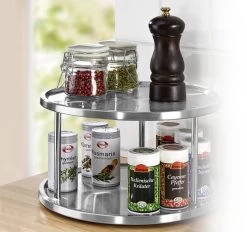 Met zijn elegante uiterlijk slaat de kastrondel niet alleen een goed figuur in de kast maar biedt hij zich ook aan als decoratieve organisatieoplossing voor het werkblad. Vooral hobbykoks zijn dol op de dubbeldekker omdat op de twee schappen veelgebruikte specerijen kruiden oliën en azijnen kunnen worden opgeborgen. Lang rommelen in het kruidenrek behoort tot het verleden want zout saffraan of de goede walnootolie zijn altijd binnen handbereik.