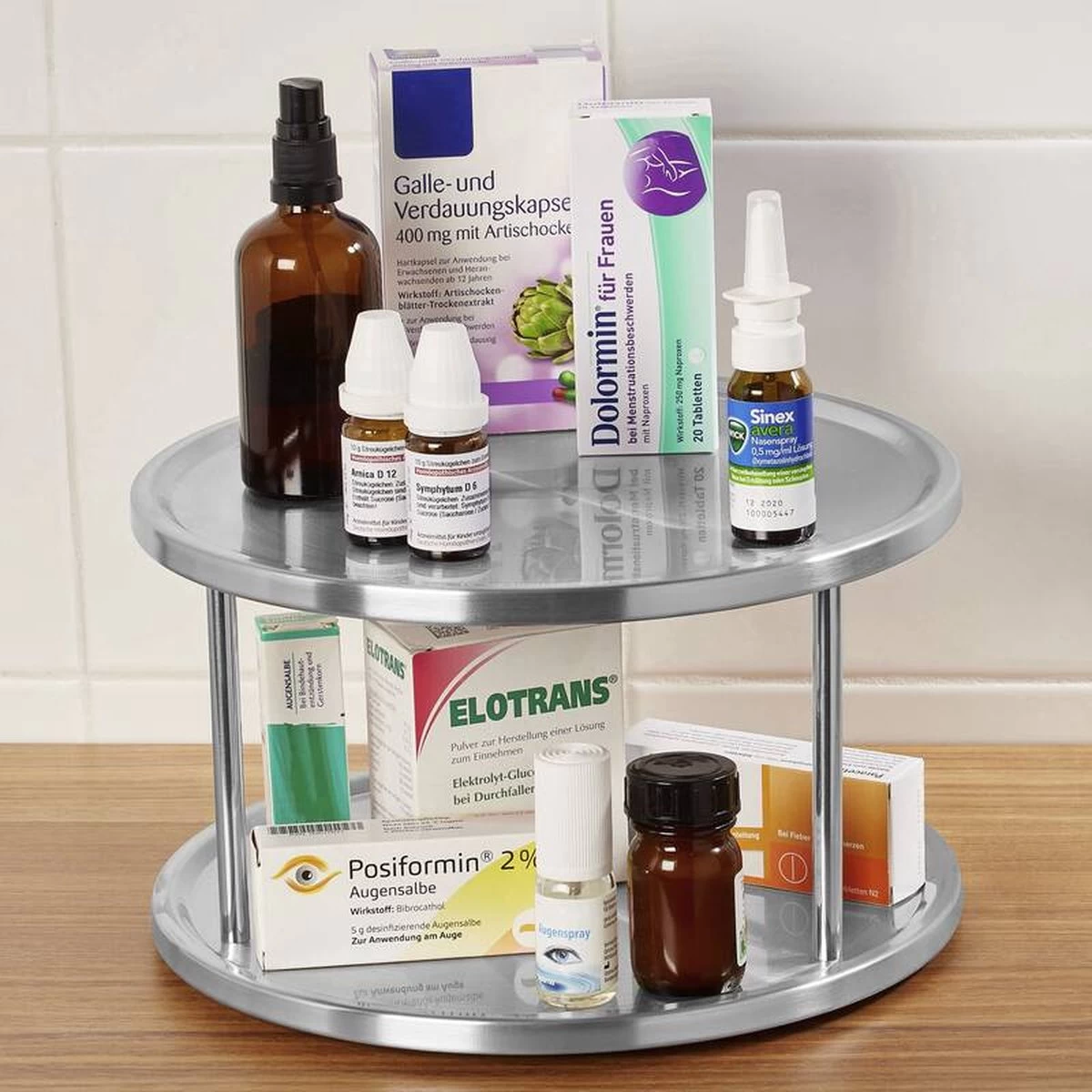 De kastrondel dubbele dekker is een echt opruimingswonder. Met zijn twee legplanken die 360 graden kunnen worden gedraaid biedt het slimme ruimtebesparende rek in een handomdraai flexibele opbergruimte die op verschillende manieren kan worden gebruikt. En het kan gebruikt worden waar je het nodig hebt. De draaimolen demonstreert zijn opruimtalent onder andere in het keukenkastje. Hier kan het roestvrijstalen draaiplateau worden gebruikt om bakingrediënten specerijen glazen en ander keukengerei te organiseren. Dankzij het dubbeldeks rek is het niet langer nodig de ladder op te klimmen om het meel helemaal achteraan in de kast te bereiken. In plaats daarvan volstaat een snelle draai aan het desbetreffende rek en het gewenste ingrediënt is binnen handbereik – zonder klimmen of rekken.