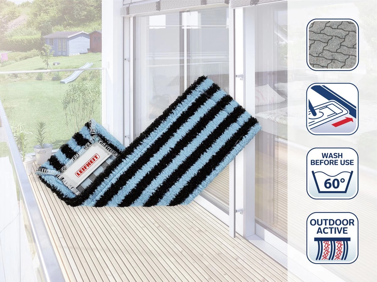 De specialist voor buiten: De strepen van de weerbestendige kunststof borstels verwijderen zelfs het hardnekkigste vuil. Of het nu om terrassen, balkons, buitentrappen of de garage gaat. De daartussen liggende microvezelstrepen nemen het verwijderde vuil op. Special clips maken de eenvoudige bevestiging aan de Leifheit-doekpers Profi mogelijk. Breedte 42 cm. Uitwasbaar op 60°C.