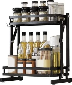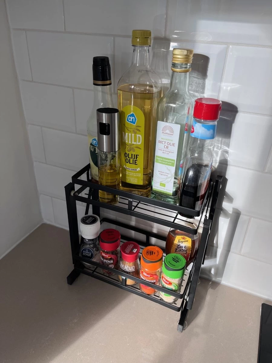 Wil jij ook een georganiseerde en nette keuken en nooit meer op zoek naar allerlei kruiden, salade dressings en oliën? De oplossing hiervoor is ons 2-laags inklapbare keukenorganizer. Deze ruime organizer werkt eenvoudig zodat jij altijd het juiste flesje of potje binnen handbereik hebt.