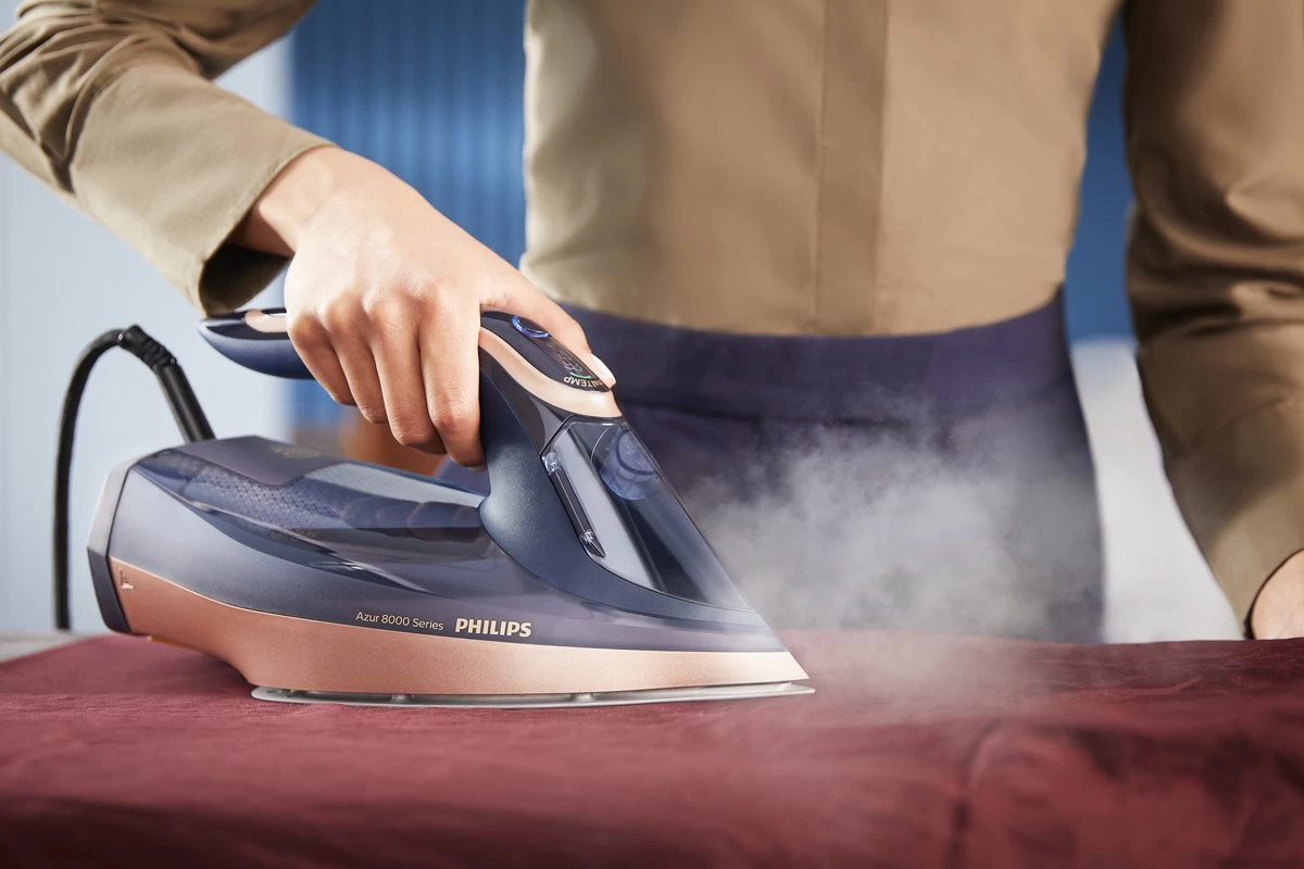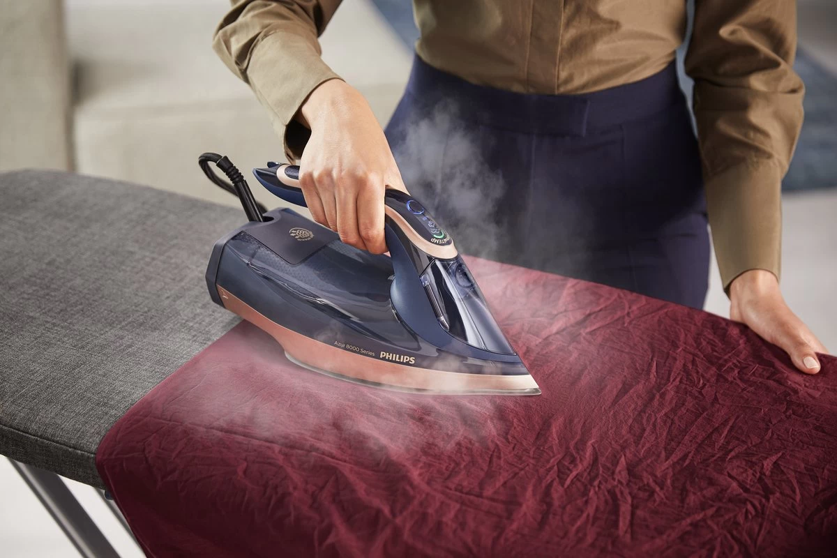 De Azur 8000-serie levert tot 85 g/min extra krachtige en consistente stoomproductie om kreuken sneller te verwijderen. - SteamGlide Elite-zoolplaat