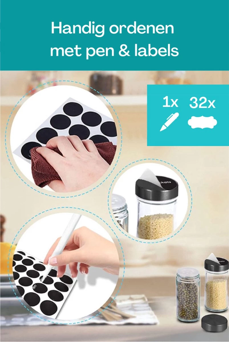 Om ervoor te zorgen dat jij de kruiden niet door elkaar haalt, zitten er 36 stickers met stift in de set. Zo kun jij je favoriete kruiden organiseren naar je eigen wensen! Daarnaast beschikt de set over een trechter, zodat de potjes eenvoudig te vullen zijn.